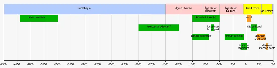 Le site de l'oppidum est fréquenté au Paléolithique (biface acheuléen ou moustérien[18]) et au Mésolithique (outils en pierre de facture locale) mais les peuplements n'y sont pas sédentarisés. C'est au Néolithique, dans la partie occidentale de l'oppidum, qu'une population s'installe de manière durable aux Châteliers[Z 1]. C'est peut-être dès cette époque, ou un peu plus tard, à l'âge du bronze, que le premier rempart est édifié ; il est constitué de terre et bordé extérieurement d'un fossé progressivement comblé entre la seconde moitié du Ier siècle av. J.-C. et le IIe siècle[L3 3]. Ce rempart n'a fait l'objet d'aucune fouille permettant de le caractériser ou de le dater[19]. Il délimite un camp d'une superficie de 8 ha, à l'intérieur duquel est concentrée la presque totalité des trouvailles d'artéfacts antérieurs à l'âge du fer. Seuls quelques fragments de haches polies sont retrouvés en dehors du camp, au sud-est de la butte de César[L 3].