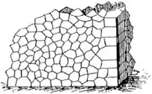 Au début de l'utilisation du mortier, au IIe siècle av. J.-C. et au début du Ier siècle av. J.-C., le parement est constitué de petits blocs de tuf de forme pyramidale, enfoncés dans le noyau du mur, et la partie visible présente une forme irrégulière. C'est ce que l'on appelle l'opus reticulatum.