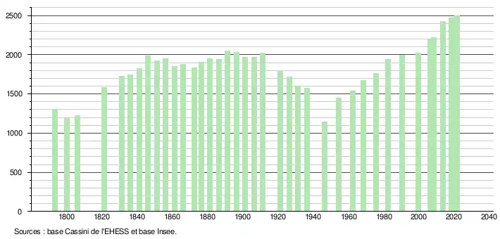 - Population municipale légale en vigueur au 1er janvier 2024, millésimée 2021, définie dans les limites territoriales en vigueur au 1er janvier 2023, date de référence statistique : 1er janvier 2021.
