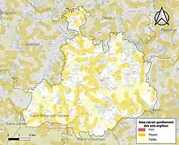 Le retrait-gonflement des sols argileux est susceptible d'engendrer des dommages importants aux bâtiments en cas d’alternance de périodes de sécheresse et de pluie[20]. 33,1 % de la superficie communale est en aléa moyen ou fort (27 % au niveau départemental et 48,5 % au niveau national métropolitain)[Carte 2]. Depuis le , en application de la loi ÉLAN, différentes contraintes s'imposent aux vendeurs, maîtres d'ouvrages ou constructeurs de biens situés dans une zone classée en aléa moyen ou fort[Note 3],[21].