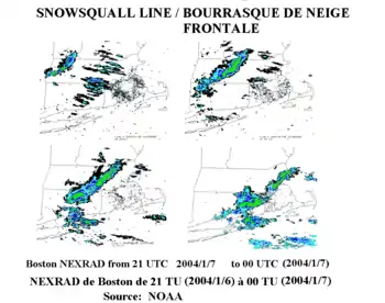 En général, le sommet de ces nuages ne dépasse pas 3 à 4 kilomètres (15 000 pieds). Cependant, au début de la saison froide, la tropopause est plus élevée et dans certains cas des sommets de plus de 7 kilomètres ont été rapportés[9]. Un bon exemple d'orages de neige imbriqués s'est produit lors de la tempête de neige Aphid à Buffalo, en aval du lac Érié, en . Mais cela peut se produire partout dans les zones côtières où il y a invasion d'air arctique (ou antarctique).