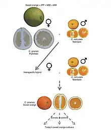En 2008, M.P. Lyon montre que l'orange 'Valencia' a connu des réarrangements chromosomiques par rapport aux oranges douces à graines. D'après Qiang Xu et al. (2012) l'apparition de l'orange douce se serait produit il y a 2300 ans au moins, une source chinoise l'attesterait en 314 av. J.-C. (selon Lun Wang et al. - 2021 - la première mention de l'orange dans un poème chinois Shanglin Fu de Ssu-ma Hsiang-ju daterait approximativement d'entre 179 et 117 av. J.-C.[20]). La reproduction asexuée (apomixie par embryon nucellaire ou greffage) expliquerait que les oranges douces actuelles sont très proches de l'espèce d'origine: «la plupart des cultivars d'oranger doux sont génétiquement un seul biotype hautement hétérozygotes, la diversification se produisant principalement par des mutations somatiques» isolées par les horticulteurs[19].