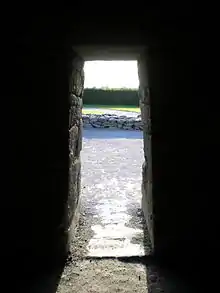 L'entrée, qui s'ouvre dans le pignon Ouest, est surmontée d'un double linteau. Dans son embrasure intérieure, deux pierres trouées sont fichées dans la maçonnerie au-dessus de l'arrière-linteau pour accueillir un système de fermeture. Une illustration publiée dans le guide vert « Irlande » de chez Gallimard[7], suggère, pour la fermeture, un abattant en bois articulé dans de grosses charnières en bois fixées dans les pierres trouées au-dessus du double linteau. Ce dispositif hypothétique s'oppose au système de fermeture classique de la porte intérieure, placée dans l'embrasure et articulée sur des gonds fichés dans un des côtés.