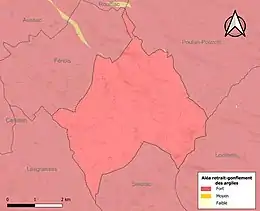 La commune est vulnérable au risque de mouvements de terrains constitué principalement du retrait-gonflement des sols argileux[22]. Cet aléa est susceptible d'engendrer des dommages importants aux bâtiments en cas d’alternance de périodes de sécheresse et de pluie. La totalité de la commune est en aléa moyen ou fort (76,3 % au niveau départemental et 48,5 % au niveau national). Sur les 130 bâtiments dénombrés sur la commune en 2019, 130 sont en aléa moyen ou fort, soit 100 %, à comparer aux 90 % au niveau départemental et 54 % au niveau national. Une cartographie de l'exposition du territoire national au retrait gonflement des sols argileux est disponible sur le site du BRGM[23],[Carte 3].