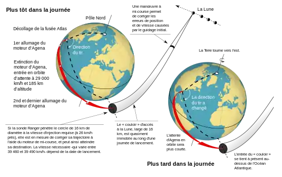 Schéma explicatif de la NASA utilisé lors de la présentation du programme Ranger, utilisant un lanceur Atlas-Agena Remarquez que l'angle de tir varie en fonction du moment du tir.