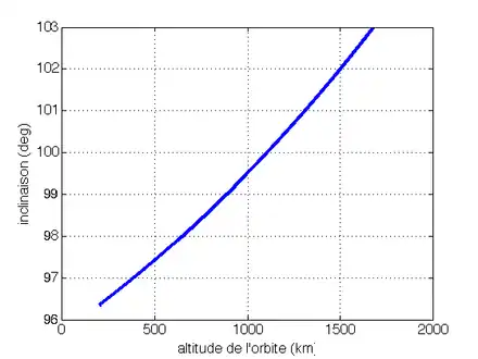 Le graphique ci-contre montre l'inclinaison requise pour une orbite héliosynchrone circulaire en fonction de son altitude.