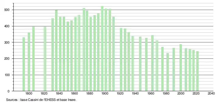 L'évolution du nombre d'habitants est connue à travers les recensements de la population effectués dans la commune depuis 1793. Pour les communes de moins de 10 000 habitants, une enquête de recensement portant sur toute la population est réalisée tous les cinq ans, les populations légales des années intermédiaires étant quant à elles estimées par interpolation ou extrapolation[25]. Pour la commune, le premier recensement exhaustif entrant dans le cadre du nouveau dispositif a été réalisé en 2006[26].