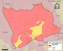 La commune est vulnérable au risque de mouvements de terrains constitué principalement du retrait-gonflement des sols argileux[15]. Cet aléa est susceptible d'engendrer des dommages importants aux bâtiments en cas d’alternance de périodes de sécheresse et de pluie. La totalité de la commune est en aléa moyen ou fort (90 % au niveau départemental et 48,5 % au niveau national). Sur les 143 bâtiments dénombrés sur la commune en 2019, 143 sont en aléa moyen ou fort, soit 100 %, à comparer aux 83 % au niveau départemental et 54 % au niveau national. Une cartographie de l'exposition du territoire national au retrait gonflement des sols argileux est disponible sur le site du BRGM[16],[Carte 2].
