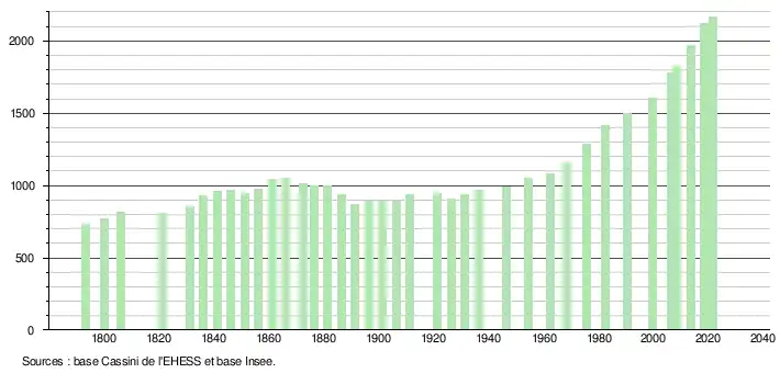 L'évolution du nombre d'habitants est connue à travers les recensements de la population effectués dans la commune depuis 1793. Pour les communes de moins de 10 000 habitants, une enquête de recensement portant sur toute la population est réalisée tous les cinq ans, les populations légales des années intermédiaires étant quant à elles estimées par interpolation ou extrapolation[22]. Pour la commune, le premier recensement exhaustif entrant dans le cadre du nouveau dispositif a été réalisé en 2008[23].
