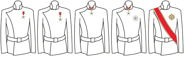 - La médaille de l'Ordre se compose d'une étoile à cinq branches en émail blanc et or repéré au centre d'un bouclier circulaire rouge, une bordure verte, avec les initiales VE couronné d'or, sous la date de fondation de l'ordre. Le tout est surmonté d'une grande couronne royale en or.