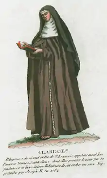 L'ordre de Sainte-Claire (en latin Ordo Sanctæ Claræ), ou l’ordre des Clarisses, ou aussi les Pauvres Dames, est un ordre religieux catholique féminin créé en 1212 par Claire d'Assise, à la demande de François d'Assise. La règle s'étant adoucie, sainte Colette réforme l'ordre au XVe siècle ; les moniales adeptes de la réforme sont alors appelées colettines. Cette réforme s'est ensuite généralisée à tout l'ordre des sœurs Clarisses.