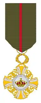 - pour les chevaliers, la croix de 40 millimètres, portée sur le côté gauche de la poitrine, à la hauteur de la boutonnière, suspendue à un ruban large de 37 millimètres.