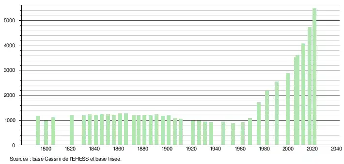L'évolution du nombre d'habitants est connue à travers les recensements de la population effectués dans la commune depuis 1793. Pour les communes de moins de 10 000 habitants, une enquête de recensement portant sur toute la population est réalisée tous les cinq ans, les populations légales des années intermédiaires étant quant à elles estimées par interpolation ou extrapolation[35]. Pour la commune, le premier recensement exhaustif entrant dans le cadre du nouveau dispositif a été réalisé en 2007[36].