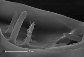 - diverses structures qui évoquent des poils ou des épines ; présentes dans les deux cavités il s'agit de sensilles (soies mécanosensibles et chémosensorielles. Selon les espèces, chez l'adulte elles sont au nombre de 15 à 20 (dont seules 6 ou 7 sont visibles dans la dépression ouverte sur l'extérieur).