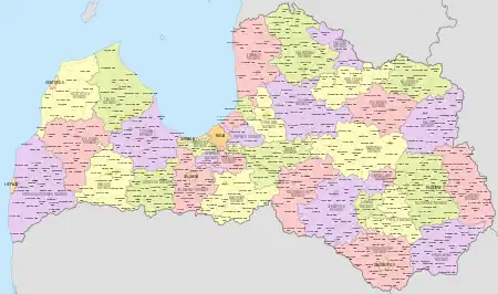 Les divisions administratives de la Lettonie ont été modifiées à compter du par une réforme administrative et territoriale. Cette réforme prévoit le découpage du territoire en 110 municipalités (en letton : novads, pluriel novadi) et 9 villes républicaines (en letton : republikas pilsētas). Les municipalités peuvent être composées d'une ville et de pagasti ou de plusieurs pagasti[1]. Quelques municipalités n'ont pas de divisions territoriales internes.