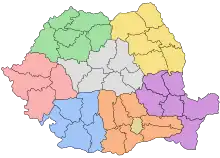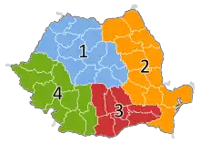 - 4 macro-régions (Macroregiuni) de niveau NUTS I, qui ne sont pas des régions administratives, mais dont le rôle est de coordonner le développement régional et les principales infrastructures.