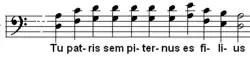 Le rythme n'est pas noté, et suit la prosodie du chant grégorien, issue de la métrique de la poésie classique.