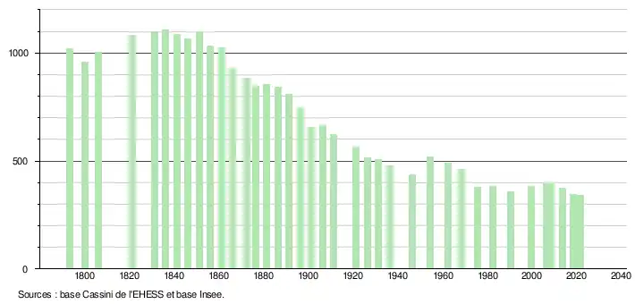 L'évolution du nombre d'habitants est connue à travers les recensements de la population effectués dans la commune depuis 1793. Pour les communes de moins de 10 000 habitants, une enquête de recensement portant sur toute la population est réalisée tous les cinq ans, les populations légales des années intermédiaires étant quant à elles estimées par interpolation ou extrapolation[17]. Pour la commune, le premier recensement exhaustif entrant dans le cadre du nouveau dispositif a été réalisé en 2008[18].