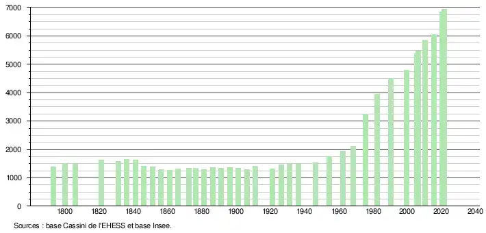 L'évolution du nombre d'habitants est connue à travers les recensements de la population effectués dans la commune depuis 1793. Pour les communes de moins de 10 000 habitants, une enquête de recensement portant sur toute la population est réalisée tous les cinq ans, les populations légales des années intermédiaires étant quant à elles estimées par interpolation ou extrapolation[37]. Pour la commune, le premier recensement exhaustif entrant dans le cadre du nouveau dispositif a été réalisé en 2005[38].