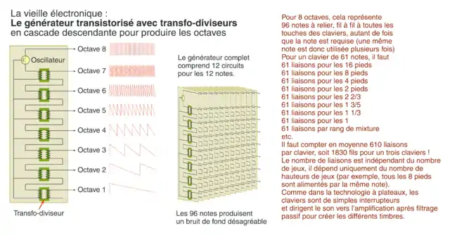 Le principe de fonctionnement de l'orgue électronique des années 1960 à 1970 s'appuie généralement sur une batterie d'oscillateurs qui génèrent en permanence toutes les notes. La méthode primitive consistait à assembler douze circuits générateurs, chacun produisant une des douze notes de la gamme chromatique déclinée en plusieurs octaves. Ainsi chaque circuit produit soit tous les do, du plus grave au plus aigu, soit tous les do♯, soit tous les ré, etc. L'ensemble des notes produites pouvait couvrir de 7 à 11 octaves selon la qualité requise.