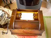 Orgue de Barbarie à rouleaux, avec son pied servant de support pour soulager le poids sur les bretelles. (Au Festival de musique mécanique de Pontrieux en 2009)