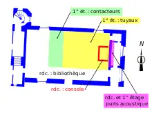 - au premier étage, au-dessus de la bibliothèque et sur l'équivalent d'une grande partie de sa surface, une petite pièce est consacrée aux contacteurs électropneumatiques entre les différents éléments de l'orgue. La partie instrumentale est contenue dans une pièce rectangulaire divisée en deux chambres. La première abrite les tuyaux du clavier de Swell, le jeu de Harp, ainsi que les 61 lames du célesta. La seconde chambre renferme les tuyaux du clavier de Great et de la Pedale, la grosse caisse et les 20 cloches tubulaires. Les sons passent aux travers de jalousies réglables actionnées depuis la console, puis sont renvoyés vers la bibliothèque par un puits sonore qui aboutit à des grilles en fer forgé occupant les panneaux de la galerie de la bibliothèque surplombant la console[9] ;