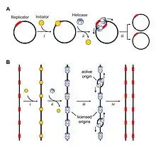 Les procaryotes ont, en général, une seule molécule d'ADN circulaire et donc en général une seule origine de réplication. Selon les espèces d'Archées, il peut y avoir une ou plusieurs origines de réplication par réplicon[1]. Les eucaryotes ont plusieurs origines de réplication sur chaque chromosome.