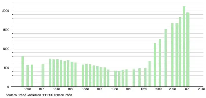 L'évolution du nombre d'habitants est connue à travers les recensements de la population effectués dans la commune depuis 1793. Pour les communes de moins de 10 000 habitants, une enquête de recensement portant sur toute la population est réalisée tous les cinq ans, les populations légales des années intermédiaires étant quant à elles estimées par interpolation ou extrapolation[30]. Pour la commune, le premier recensement exhaustif entrant dans le cadre du nouveau dispositif a été réalisé en 2005[31].