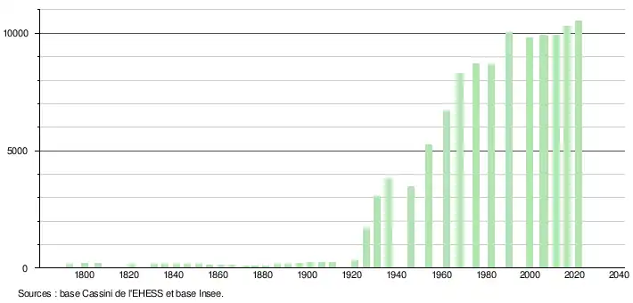L'évolution du nombre d'habitants est connue à travers les recensements de la population effectués dans la commune depuis 1793. Pour les communes de plus de 10 000 habitants les recensements ont lieu chaque année à la suite d'une enquête par sondage auprès d'un échantillon d'adresses représentant 8 % de leurs logements, contrairement aux autres communes qui ont un recensement réel tous les cinq ans[28],[Note 3].