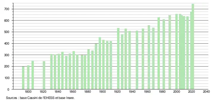 L'évolution du nombre d'habitants est connue à travers les recensements de la population effectués dans la commune depuis 1793. Pour les communes de moins de 10 000 habitants, une enquête de recensement portant sur toute la population est réalisée tous les cinq ans, les populations légales des années intermédiaires étant quant à elles estimées par interpolation ou extrapolation[23]. Pour la commune, le premier recensement exhaustif entrant dans le cadre du nouveau dispositif a été réalisé en 2004[24].