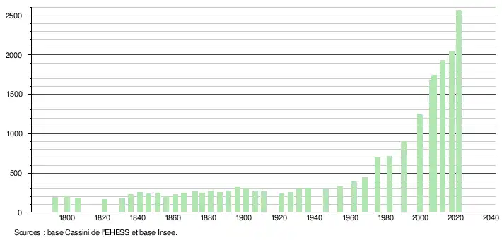 L'évolution du nombre d'habitants est connue à travers les recensements de la population effectués dans la commune depuis 1793. Pour les communes de moins de 10 000 habitants, une enquête de recensement portant sur toute la population est réalisée tous les cinq ans, les populations légales des années intermédiaires étant quant à elles estimées par interpolation ou extrapolation[50]. Pour la commune, le premier recensement exhaustif entrant dans le cadre du nouveau dispositif a été réalisé en 2007[51].