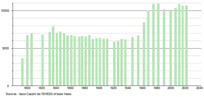 - Par convention dans Wikipédia, le principe a été retenu de n’afficher dans le tableau des recensements et le graphique, pour les populations légales postérieures à 1999, que les populations correspondant à une enquête exhaustive de recensement pour les communes de moins de 10 000 habitants, et que les populations des années 2006, 2011, 2016, etc. pour les communes de plus de 10 000 habitants, ainsi que la dernière population légale publiée par l’Insee pour l'ensemble des communes.