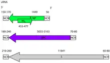 Les génomes des Orthonairovirus sont des ARN simple brin de sens négatif. Le génome complet est constitué d'environ 17 100 à 22 800 nucléotides et est divisé en trois segments circulaires : un grand, un moyen et un petit[2]. Le grand segment comprend de l'ordre de 11 200 à 14 400 nucléotides (11.2 à 14,4 kb) et code la polymérase virale[1],[3]. Le segment moyen a une longueur d'environ 4 400 à 6 300 nucléotides (4.4 à 6,3 kb) et code les glycoprotéines Gn et Gc[1],[3]. Le petit segment mesure de l'ordre de 1 700 à 2 100 nucléotides (1.7 à 2.1 kb) et code la protéine de la nucléocapside[2],[1],[3].