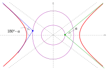 Les branches de l'hyperbole fournissent les isoptiques pour les deux angles α et 180° − α (voir image).