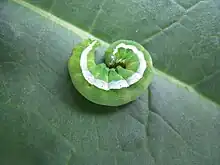 La chenille atteint 40 mm de long, plutôt adipeuse. Le corps est vert-jaunâtre avec une ligne blanche très marquée sur le flanc.