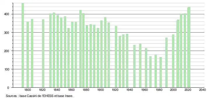 L'évolution du nombre d'habitants est connue à travers les recensements de la population effectués dans la commune depuis 1793. Pour les communes de moins de 10 000 habitants, une enquête de recensement portant sur toute la population est réalisée tous les cinq ans, les populations légales des années intermédiaires étant quant à elles estimées par interpolation ou extrapolation[20]. Pour la commune, le premier recensement exhaustif entrant dans le cadre du nouveau dispositif a été réalisé en 2005[21].