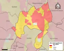 La commune est vulnérable au risque de mouvements de terrains constitué principalement du retrait-gonflement des sols argileux[16]. Cet aléa est susceptible d'engendrer des dommages importants aux bâtiments en cas d’alternance de périodes de sécheresse et de pluie. 97,1 % de la superficie communale est en aléa moyen ou fort (67,5 % au niveau départemental et 48,5 % au niveau national). Sur les 254 bâtiments dénombrés sur la commune en 2019, 252 sont en aléa moyen ou fort, soit 99 %, à comparer aux 90 % au niveau départemental et 54 % au niveau national. Une cartographie de l'exposition du territoire national au retrait gonflement des sols argileux est disponible sur le site du BRGM[17],[Carte 2].