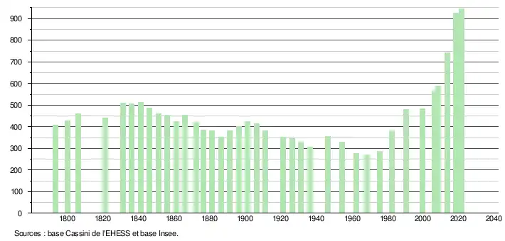 L'évolution du nombre d'habitants est connue à travers les recensements de la population effectués dans la commune depuis 1793. Pour les communes de moins de 10 000 habitants, une enquête de recensement portant sur toute la population est réalisée tous les cinq ans, les populations légales des années intermédiaires étant quant à elles estimées par interpolation ou extrapolation[22]. Pour la commune, le premier recensement exhaustif entrant dans le cadre du nouveau dispositif a été réalisé en 2008[23].