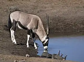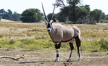L'oryx gazelle ou gemsbok (Oryx gazella) est une espèce de bovidé souvent considérée comme une antilope, bien qu'elle ne soit pas de la sous-famille des Antilopinae, mais de celle des Hippotraginae. On la trouve des dunes désertiques de la Namibie (il en est d'ailleurs l'animal national[1]) aux savanes arides du désert du Kalahari. Le nom oryx gazelle vient de la beauté de son pelage ; l'animal a de grands traits noirs sur ses flancs, ses pattes et sa tête claire, celle-ci paraissant maquillée. Il est très commun par rapport aux autres espèces d'oryx comme l'oryx algazelle, éteint à l'état sauvage. Comme le gnou, l'oryx gemsbok peut être doré.