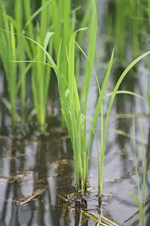 Oryza sativa[3] est une plante herbacée annuelle aux tiges (chaumes) dressées ou géniculées ascendantes pouvant atteindre de 45 à 180 cm de long et comptant de 3 à 20 nœuds[4]. La taille des plantes est cependant très variable : si la plupart des variétés cultivées ont de 1 à 2 mètres de haut, certaines variétés naines ne dépassent pas 30 à 40 cm de haut tandis que les tiges de certaines variétés flottantes peuvent dépasser 7 mètres de long[5].