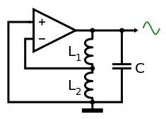 L'oscillateur Hartley est le circuit miroir de l'oscillateur Colpitts qui utilise un diviseur de tension composé de deux condensateurs plutôt que de deux inductances. Bien qu'il ne soit pas nécessaire qu'il y ait un couplage mutuel entre les deux segments de bobine, le circuit est généralement mis en œuvre en utilisant une bobine à prise, avec la rétroaction prise à partir de la prise, comme indiqué ici. Le point de raccordement optimal (ou le rapport des inductances des bobines) dépend du dispositif d'amplification utilisé, qui peut être un transistor bipolaire, un FET, une triode ou un amplificateur de presque n'importe quel type (non inverseur dans ce cas, bien que des variantes du circuit avec un point central mis à la terre et une rétroaction d'un amplificateur inverseur ou du collecteur/drain d'un transistor soient également courantes), mais un JFET ou une triode sont souvent utilisés car un bon degré de stabilité de l'amplitude (et donc de réduction de la distorsion) peut être obtenu avec une simple combinaison résistance-capacité de fuite de grille en série avec la grille grâce à la conduction de la diode sur les pics du signal qui crée une polarisation négative suffisante pour limiter l'amplification.