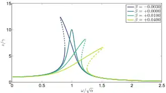 La réponse fréquentielle de cet oscillateur décrit l'amplitude z d'une réponse en régime permanent de l'équation (x(t)) à une fréquence donnée pour une excitation ω. Pour un oscillateur linéaire avec β = 0, la réponse fréquentielle est également linéaire. Cependant, pour un terme de Duffing non nul, la réponse fréquentielle devient non linéaire. Selon le type de non-linéarité, l'oscillateur de Duffing peut montrer une réponse fréquentielle raide, souple ou mixte. Par la méthode d'analyse par homotopie ou d'équilibrage harmonique, on peut dériver une équation de la réponse fréquentielle de la forme[9],[5]: