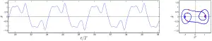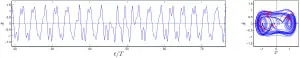 Certains exemples typiques de séries temporelles et portraits de phase de l'équation de Duffing, montrant l'apparition de sous-harmoniques par des bifurcations à doublement de période – ou des comportements chaotiques. L'amplitude forcée augmente de γ = 0,2 à γ = 0,65. Les autres paramètres ont les valeurs α = –1, β = +1, δ = 0,3 et ω = 1,2. Les conditions initiales sont x(0) = 1 et Les points rouges dans les portraits de phase sont aux temps t pour un multiple entier de la période T = 2π/ω[9].