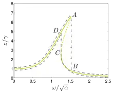 - quand la fréquence angulaire ω est augmentée lentement (avec les autres paramètres fixés), l'amplitude de réponse z chute violemment,