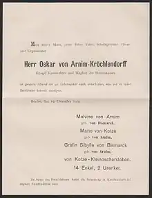 Oscar von Arnim épouse Malwine von Bismarck à Schönhausen en 1844, fille de Ferdinand von Bismarck-Schönhausen (1771-1845) et de Luise Wilhelmine Menken (1789-1839) et sœur unique du chancelier Otto von Bismarck. Sa fille Sibylle von Arnim (1864-1945), nièce du chancelier, épouse en 1885 son cousin Wilhelm comte von Bismarck-Schönhausen (1852-1901), haut président de la province de Prusse-Orientale et fils du prince Otto von Bismarck (1815-1898) et de Johanna von Puttkamer (1824-1894).