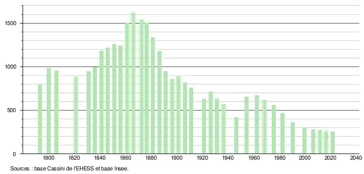 L'évolution du nombre d'habitants est connue à travers les recensements de la population effectués dans la commune depuis 1793. Pour les communes de moins de 10 000 habitants, une enquête de recensement portant sur toute la population est réalisée tous les cinq ans, les populations légales des années intermédiaires étant quant à elles estimées par interpolation ou extrapolation[14]. Pour la commune, le premier recensement exhaustif entrant dans le cadre du nouveau dispositif a été réalisé en 2006[15].