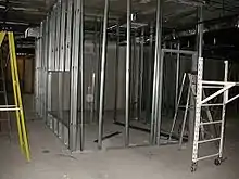 De fines feuilles d'acier galvanisé peuvent être pliées à froid en montants d'ossature en acier pour des usages structurels ou non structurels, pour des murs extérieurs et des cloisons, dans des projets de construction résidentiels, commerciaux et industriels. La dimension de la pièce est établie avec un rail horizontal qui est ancré au sol et au plafond pour délimiter chaque pièce. Les poteaux verticaux sont disposés dans les rails, généralement espacés 16 pouces (406,4 mm) et fixés en haut et en bas.