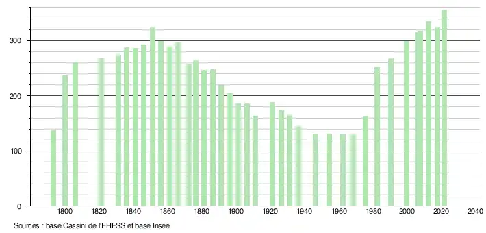 L'évolution du nombre d'habitants est connue à travers les recensements de la population effectués dans la commune depuis 1793. Pour les communes de moins de 10 000 habitants, une enquête de recensement portant sur toute la population est réalisée tous les cinq ans, les populations légales des années intermédiaires étant quant à elles estimées par interpolation ou extrapolation[18]. Pour la commune, le premier recensement exhaustif entrant dans le cadre du nouveau dispositif a été réalisé en 2007[19].