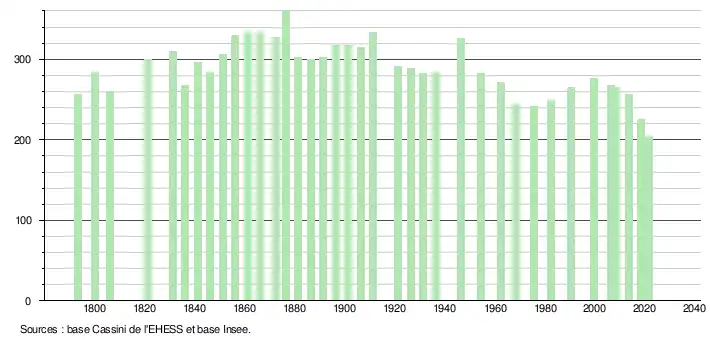 L'évolution du nombre d'habitants est connue à travers les recensements de la population effectués dans la commune depuis 1793. Pour les communes de moins de 10 000 habitants, une enquête de recensement portant sur toute la population est réalisée tous les cinq ans, les populations légales des années intermédiaires étant quant à elles estimées par interpolation ou extrapolation[33]. Pour la commune, le premier recensement exhaustif entrant dans le cadre du nouveau dispositif a été réalisé en 2008[34].