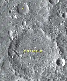 Ostwald est un cratère lunaire situé sur la face cachée de la Lune. Le cratère Ostwald est situé juste à côté des cratères Guyot et Ibn Firnas. Les bords du cratère sont irréguliers et déformés par des impacts ultérieurs notamment par plusieurs cratèrelets. L'ensemble du cratère est grandement raviné et érodé.